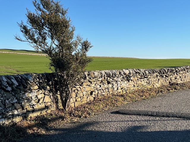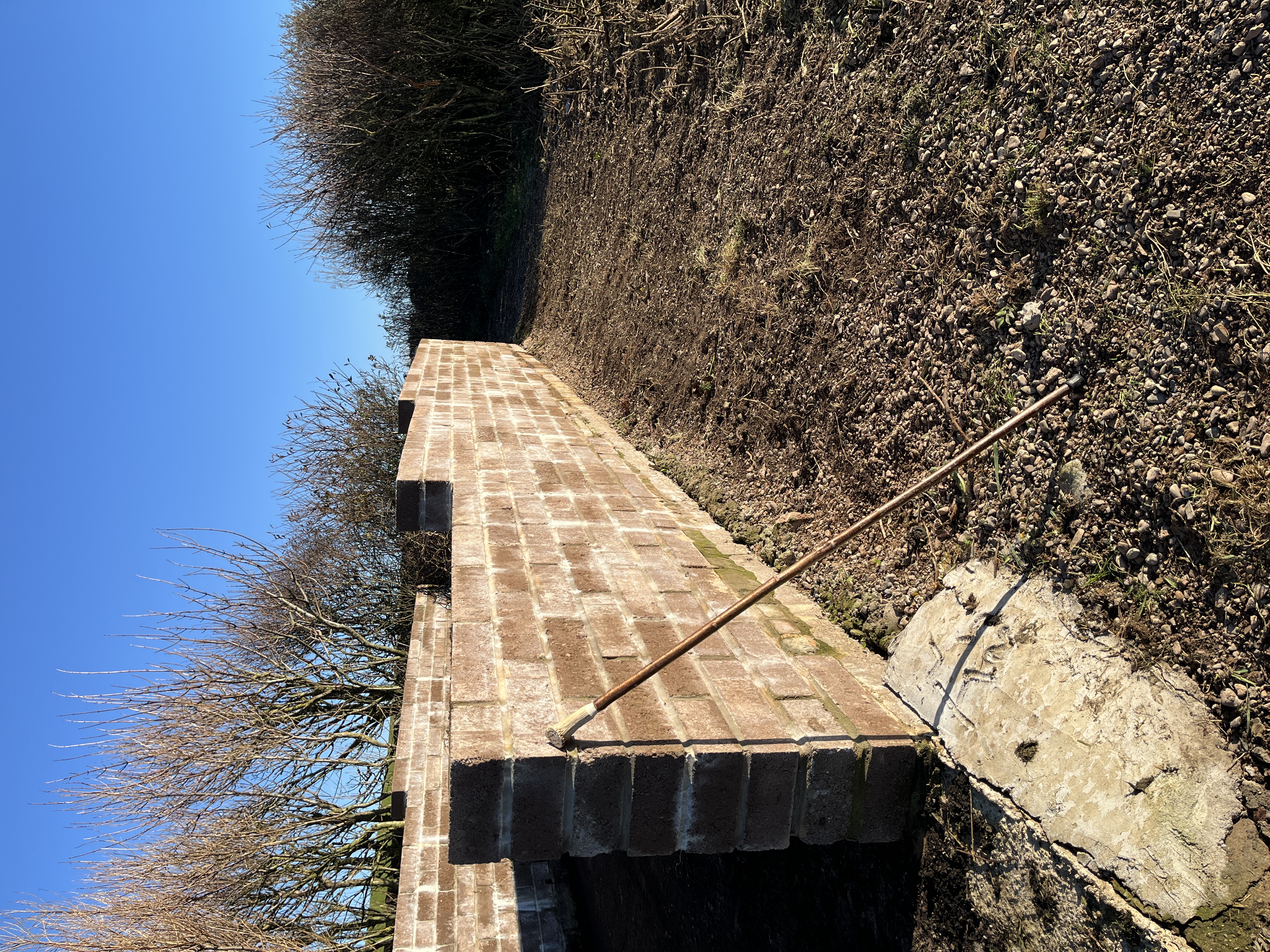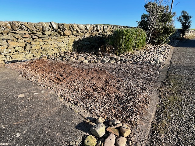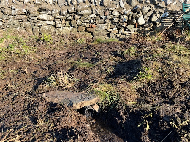 To the left of Mr G’s bench as you face it. A field drain from Isle Farm was putting water underneath the dyke and making the ground boggy. A trench and field drain are now taking the water away onto the shore.